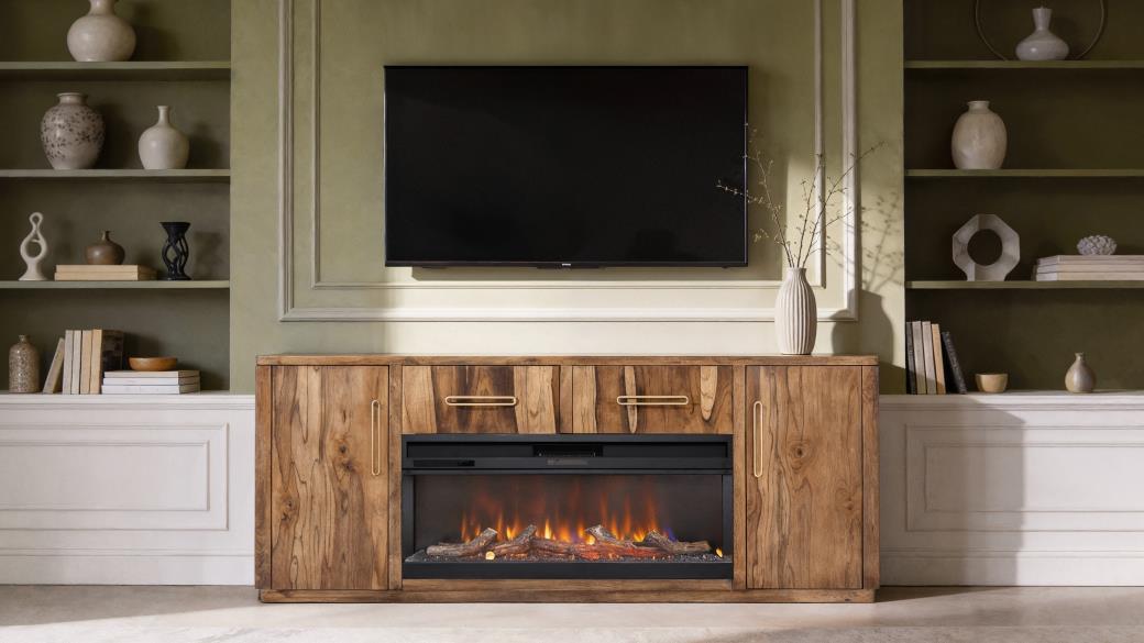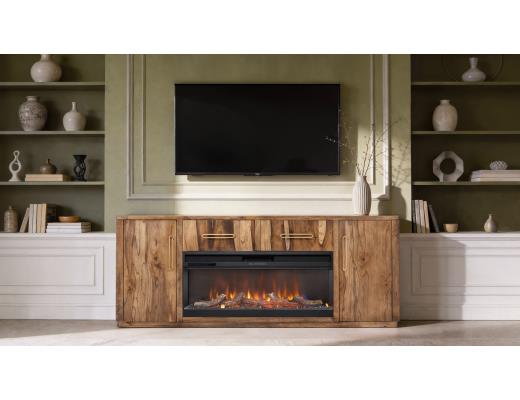 Our Balam collection is handcrafted from mango and teak wood. This simple yet stunning collection will bring an organic, modern touch to your space. This 80-inch TV stand becomes the heart of your living space, featuring two drawers and two doors for ample storage and a design that highlights the wood’s unique grain. Now enhanced with a fireplace insert, it offers not only style but also a cozy ambiance. Pair it with two matching piers to form a stunning wall unit that frames your space with harmony and sophistication. Every detail speaks of artistry, transforming your home into a sanctuary where modern design meets timeless warmth.