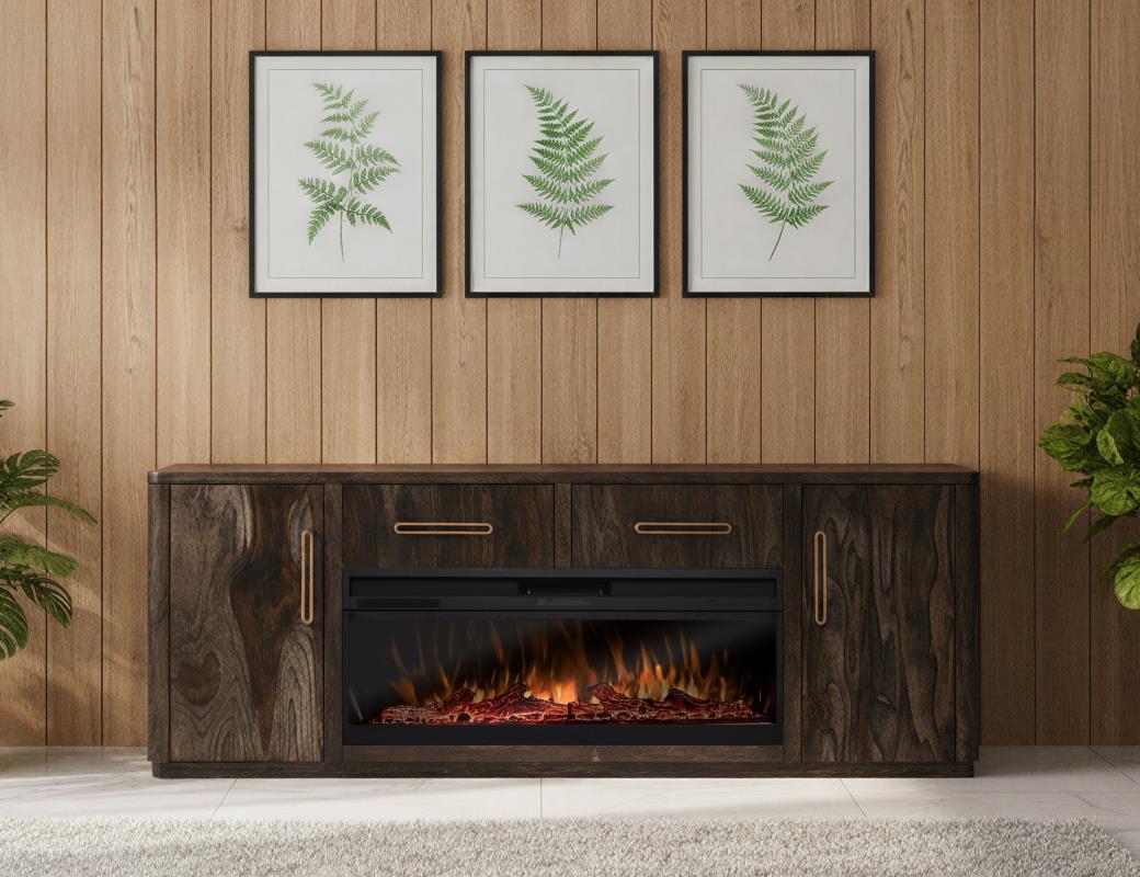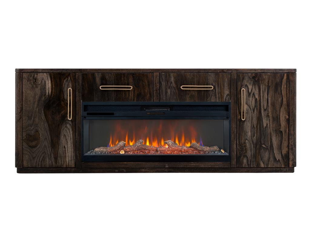 Our Balam collection is handcrafted from mango and teak wood. This simple yet stunning collection will bring an organic, modern touch to your space. This 80-inch TV stand becomes the heart of your living space, featuring two drawers and two doors for ample storage and a design that highlights the wood’s unique grain. Now enhanced with a fireplace insert, it offers not only style but also a cozy ambiance. Pair it with two matching piers to form a stunning wall unit that frames your space with harmony and sophistication. Every detail speaks of artistry, transforming your home into a sanctuary where modern design meets timeless warmth.