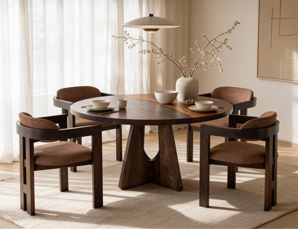 The Raramuri round dining table is a high-quality addition to any dining room, crafted from sustainable mango and melina wood, featuring a unique finish. The dining table set highlights the natural beauty and tonal variations of mango wood. The pedestal base with a geometric design is made from sturdy wood, providing a stable, long-lasting foundation and making it ideal for everyday use.