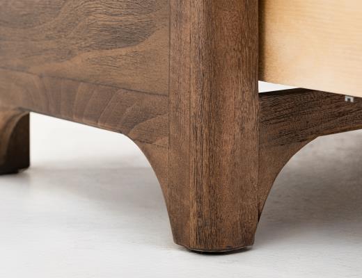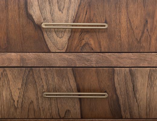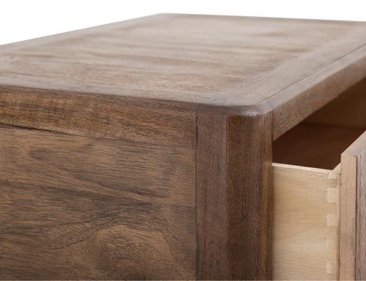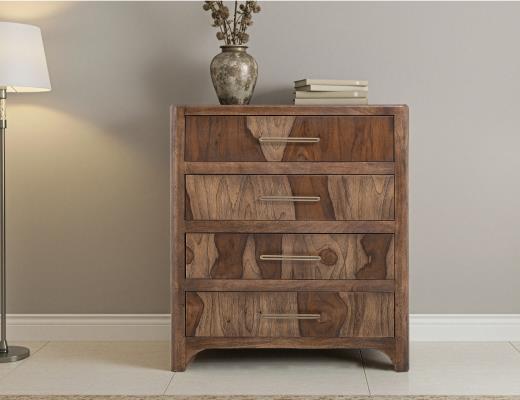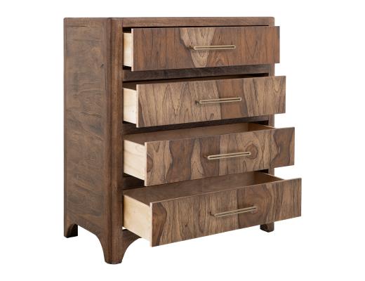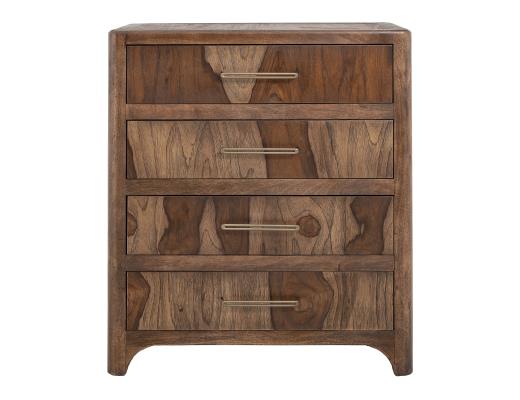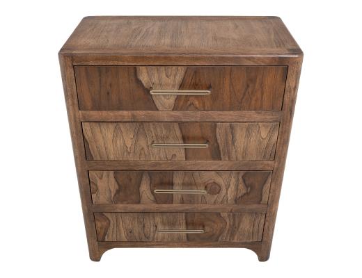 Transform your space with this modern bedroom set. Crafted from engineered teak and sustainable mango wood, this collection combines lasting durability with natural beauty. The rich brown multi-step lacquer finish adds warmth and depth to the furniture. The Praga chest has four spacious drawers for ample storage. The aged golden handles add a touch of sophistication, while its short, sturdy legs provide balance and stability, making it a versatile addition to any space.