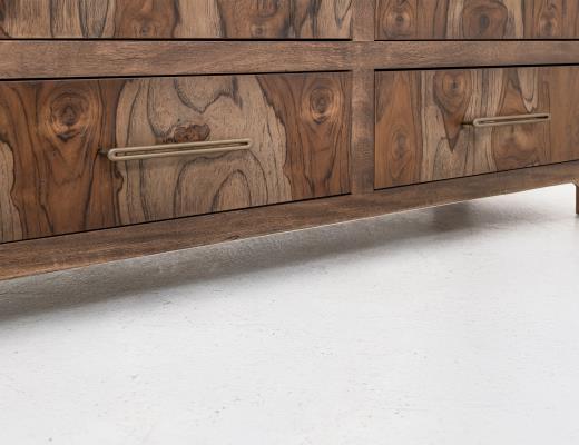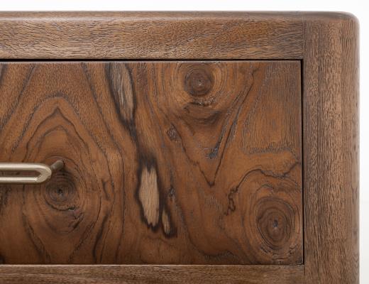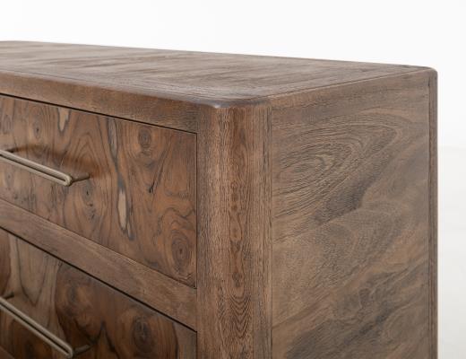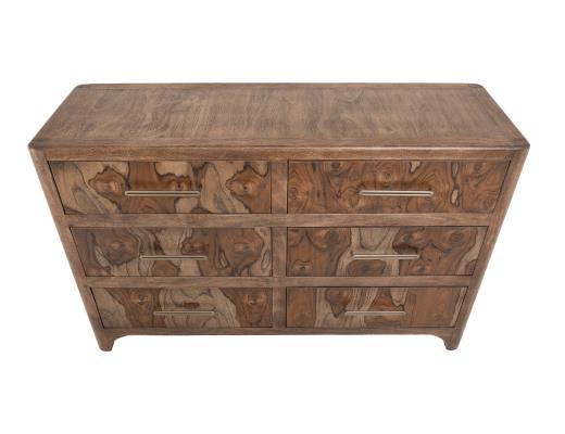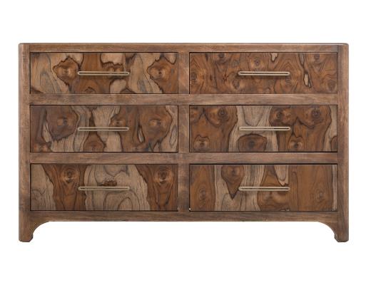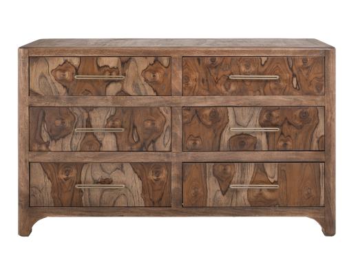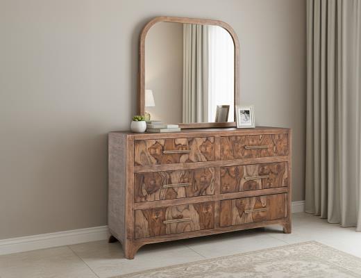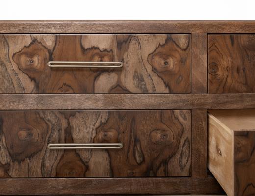 Transform your space with this modern bedroom set. Crafted from engineered teak and sustainable mango wood, this collection combines lasting durability with natural beauty. The rich brown multi-step lacquer finish adds warmth and depth to the furniture. The Praga Dresser has six spacious drawers for ample storage. The aged golden handles add a touch of sophistication, while its short, sturdy legs provide balance and stability, making it a versatile addition to any space.