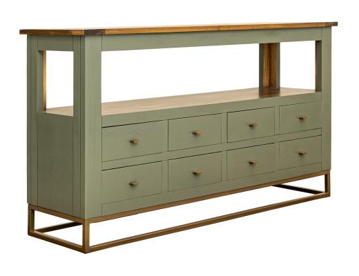 The Timber Occasional Tables are remarkable furniture pieces that beautifully combine functionality and style. Designed to enhance your living room, these tables are crafted from high-quality pine and poplar wood and showcase a rich, multi-step lacquer in an eye-catching green finish. They are accented by a hand-rubbed brown top that enhances the wood's natural beauty. The Sofa table has eight drawers that glide smoothly on wood-on-wood slides and an open shelf below it. It is perfect for displaying décor or storing essentials, offering ample space for your essentials. Supported by a sleek gold metal base, the Timber Occasional Tables are an elegant and functional addition to any space.