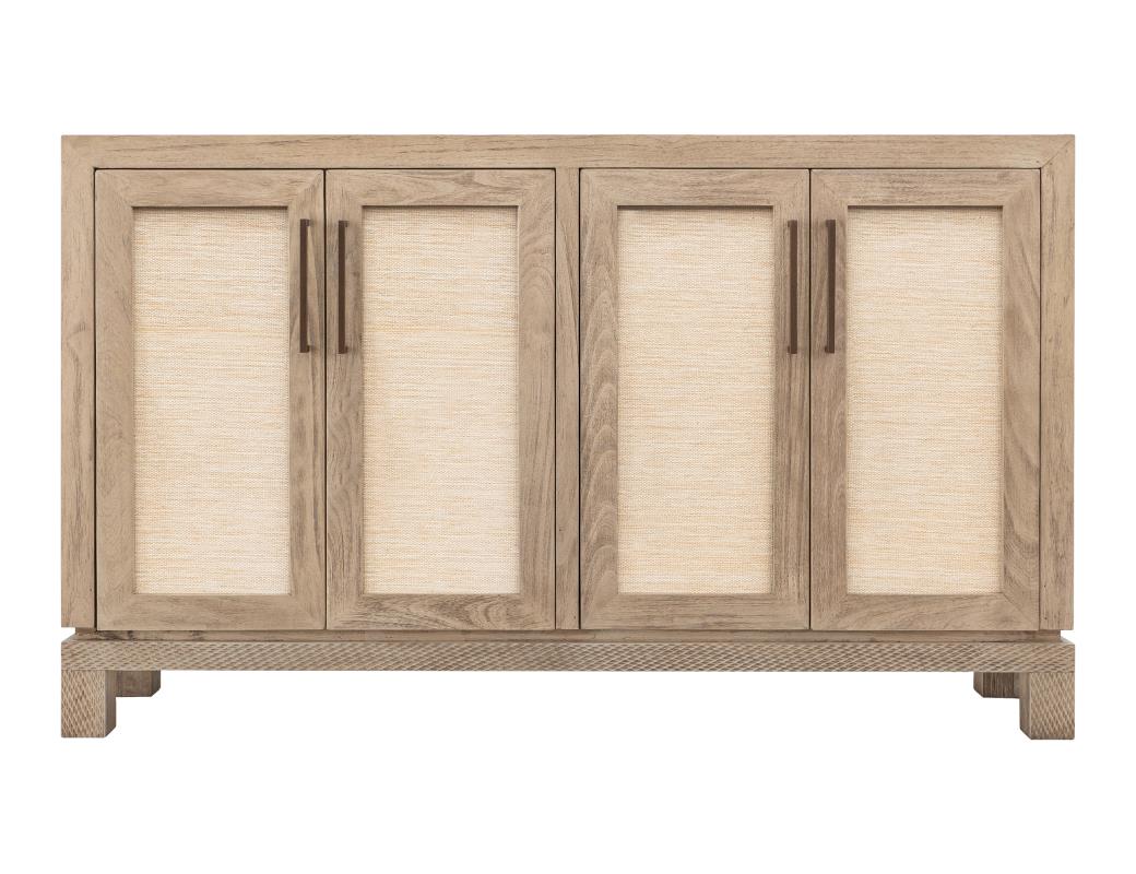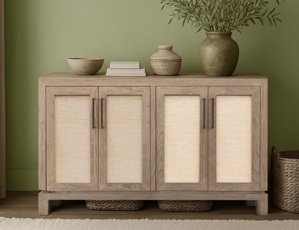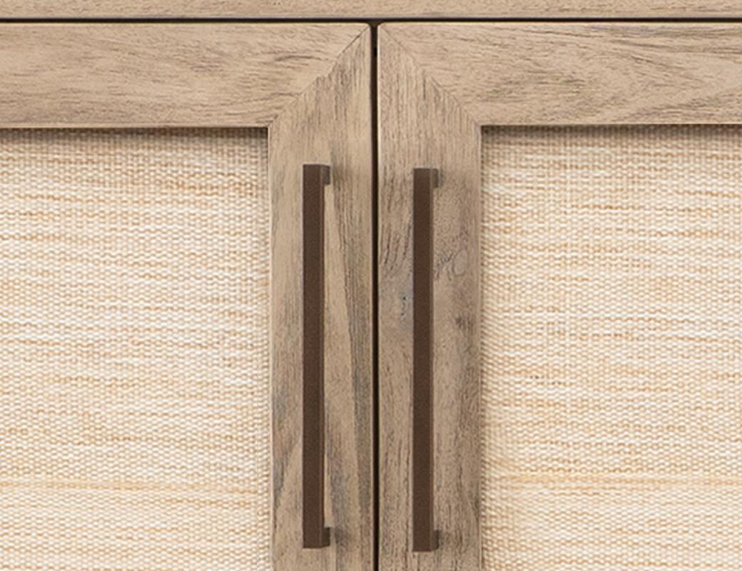 SolaraBring warmth and character to your home with the Solara Console, expertly handcrafted from solid Melina wood and finished in a white lacquer. The door panels are adorned with woven yucca fiber, and the base features CNC-machine textured, providing a touch of organic charm and elegance. It features two shelves for practical storage and custom metal pulls; the Solara seamlessly combines artistic details with functional design, crafted to be cherished for a lifetime.