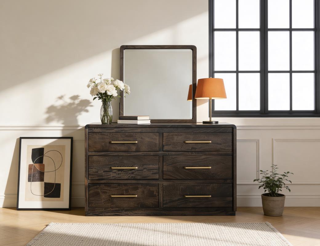 Introducing The Dark Mezquite Collection: This exquisite collection is meticulously handcrafted from sustainable mango wood. Its dark finish gracefully accentuates the natural richness of the wood grain. The Mezquite mirror is designed to perfectly complement the dresser, adding a touch of sophistication to your bedroom décor.